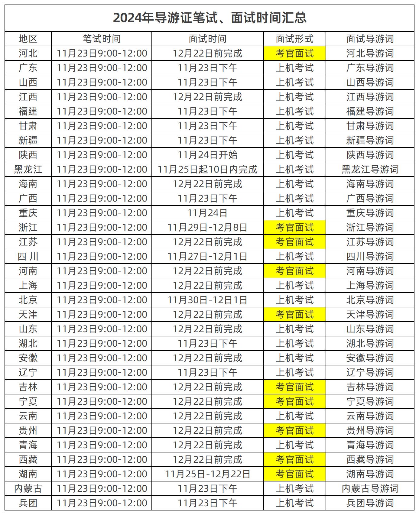 2024年导游证笔试考试定在11月23日,面试于12月22日前组织完成,各省面试时间略有不同。